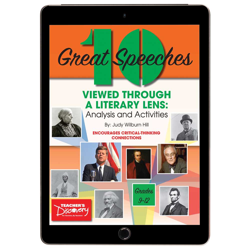 What was happening in the world when a famous speech was given? Why did the speaker choose the topic and the theme of the speech? Who was in the audience? What mattered to them? Students actively apply literary techniques–as they do when studying fiction–and intensely examine a nonfiction piece. As they discover the methods the speaker used in composing the speech, and evaluate the often subtle literary practices, they learn what made a well-known speech compelling and memorable.table align=”center” border=”1″ cellpadding=”1″ cellspacing=”1″ height=”300″ width=”744″ thead tr th scope=”col” Includes these famous speeches: /th th scope=”col” Units feature: /th /tr /thead tbody tr td “Give Me Liberty, or Give Me Death,” by Patrick Henry “Ain;#39;t I a Woman?” by Sojourner Truth “The Meaning of July Fourth for the Negro,” by Frederick Douglass “The Gettysburg Address,” by Abraham Lincoln “Women;#39;s Right to Vote,” by Susan B. Anthony “Their Finest Hour,” by Sir Winston Churchill “Day of Infamy,” by Franklin Delano Roosevelt Inaugural Address, by John F. Kennedy “I Have a Dream,” by Martin Luther King, Jr. Election Night Victory Speech, by Barack Obama /td td author biographies context of the time images vocabulary exercises analysis and evaluation writing prompts online activities individual and group activities web links to performances, and more! /td /tr /tbody/tableCopyright 2016. English. High school. Reproducible. 200 pages.Book Download: PDF. PDF pages include color images and clickable web links.Print Book: Softcover. 8 x 11 inches. Black and white pages.img alt=”” src=”//aedownload.net/teachersdiscovery/images/Author_Judy_Hill.jpg” style=”float: left; border-width: 0px; border-style: solid; margin: 0px 6px; height: 160px; padding-right: 10px;” /About the AuthorJudy Wilburn Hill / earned her bachelor’s degree in Education at Texas Christian University and her master’s degree in English at the University of North Texas. She has taught secondary English, served as Coordinator for Advanced Academics, and worked as a Curriculum Specialist. She served as English department head and created the SAT Prep programs for various high schools.Judy’s passion is British literature, and she has visited England three times to enhance her knowledge and teaching. Having taught ninth-grade English through Advanced Placement English Literature and Composition, she has a passion for teaching all levels of students.