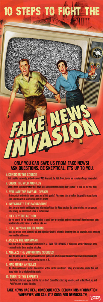 Debunk misinformation by teaching your students to be critical consumers of media. Includes steps such as examining the quality of a source, reading critically and without bias, researching to provide supporting evidence, and fact-checking. Your students will become experts at evaluating news sources.Copyright 2017. Middle school, high school. 13 x 38 inches. Laminated to last.