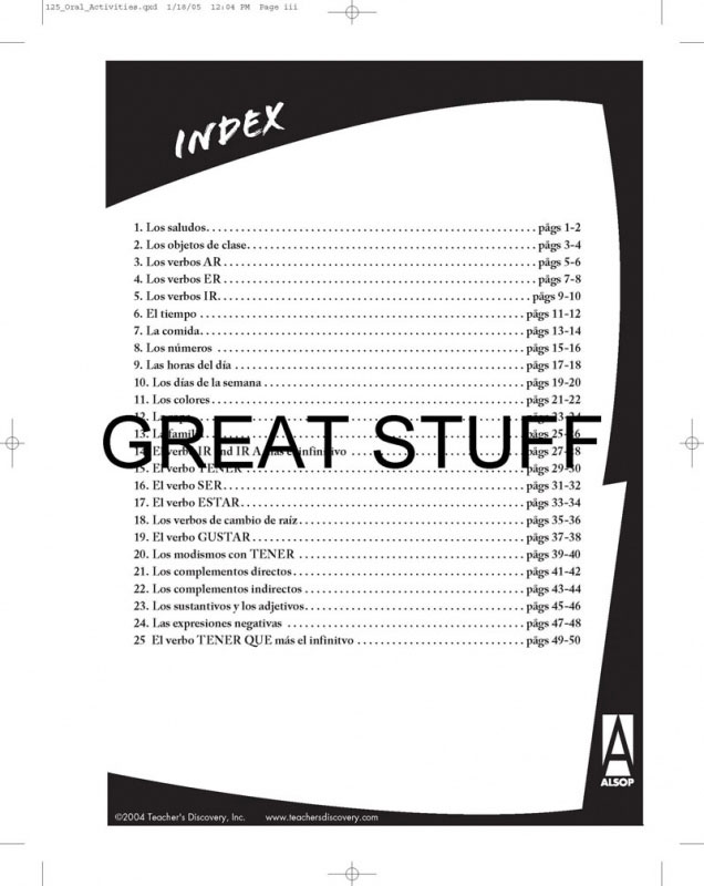 Cool illustrations inspire students to be creative and talk in Spanish about topics they like! Contains 125 activities that help beginners to learn and orally practice -AR, -ER,/em and -IR/em in the present tense, plus food, weather, greetings, colors, classroom objects and other first-year vocabulary. Rubrics included.Copyright 2006. Spanish. Beginning. Middle school, high school.Reproducible.51 pages.Book Download: PDF.Adobe Reader required to view PDF.Print Book:Softcover, 8 x 11 inches.img alt=”” src=”//aedownload.net/teachersdiscovery/images/Author_Tom_Alsop.jpg” style=”float: left; border-width: 0px; border-style: solid; margin: 0px 6px; height: 155px; padding-right: 10px;” /About the AuthorAward-winning teacher, presenter, and author Tom Alsop/ continues to share his many years of teaching experience through his popular Teacher’s Discovery readers, grammar books and activity books. His books provide an array of creative, student-centered, hands-on activities that allow students to actively participate in class while using the target language.Tom is a former middle school and high school Spanish teacher who now teaches Spanish at Butler University in Indianapolis. He often presents at world language conferences and leads workshops at schools around the country. He is the director of three summer Spanish teacher immersion programs (Aventura Cultural/) for high school and middle school teachers in Havana, Cuba; Madrid, Spain; and Guadalajara, Mexico.