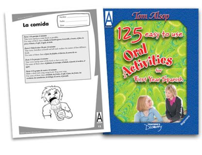 Cool illustrations inspire students to be creative and talk in Spanish about topics they like! Contains 125 activities that help beginners to learn and orally practice -AR, -ER,/em and -IR/em in the present tense, plus food, weather, greetings, colors, classroom objects and other first-year vocabulary. Rubrics included.Copyright 2006. Spanish. Beginning. Middle school, high school.Reproducible.51 pages.Book Download: PDF.Adobe Reader required to view PDF.Print Book:Softcover, 8 x 11 inches.img alt=”” src=”//aedownload.net/teachersdiscovery/images/Author_Tom_Alsop.jpg” style=”float: left; border-width: 0px; border-style: solid; margin: 0px 6px; height: 155px; padding-right: 10px;” /About the AuthorAward-winning teacher, presenter, and author Tom Alsop/ continues to share his many years of teaching experience through his popular Teacher’s Discovery readers, grammar books and activity books. His books provide an array of creative, student-centered, hands-on activities that allow students to actively participate in class while using the target language.Tom is a former middle school and high school Spanish teacher who now teaches Spanish at Butler University in Indianapolis. He often presents at world language conferences and leads workshops at schools around the country. He is the director of three summer Spanish teacher immersion programs (Aventura Cultural/) for high school and middle school teachers in Havana, Cuba; Madrid, Spain; and Guadalajara, Mexico.