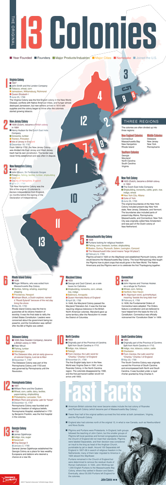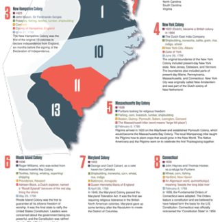 Fast facts about the original 13 colonies, including important dates, founders, and interesting details about the colonies that became the building blocks of the United States. Copyright 2017. All levels. 13 x 38 inches. Laminated to last.