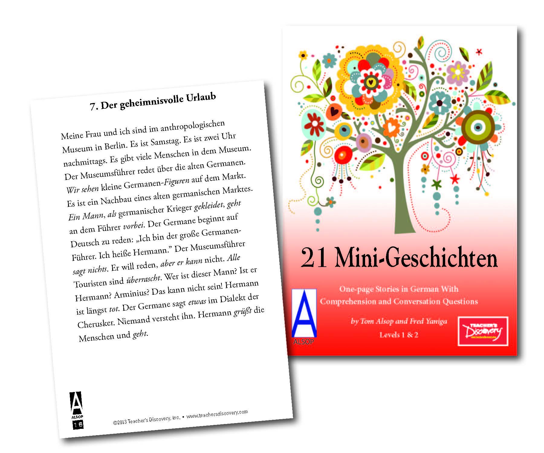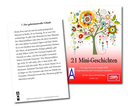 Twenty-one short, short stories in the present tense engage teen readers with one-page topical tales–now in German! Thorough (written and oral) discussion questions follow each chapter and ensure a beginning student’s complete understanding of the story and dialogue. Use each as a filler lesson, or wrap a unit around the interaction and vocabulary. Includes teaching suggestions; a complete glossary, listed by chapter, is in the back of the book. Level 2br /Unique Words: extensivebr /Tense(s): presentbr /Glossary: yesCopyright 2013. German. Level 2. 5 x 7 inches. Softcover, 58 pages. img alt=”” src=”//aedownload.net/teachersdiscovery/images/Author_Tom_Alsop.jpg” style=”float: left; border-width: 0px; border-style: solid; margin: 0px 6px; height: 155px; padding-right: 10px;” /About the Author Award-winning teacher, presenter, and author Tom Alsop/ continues to share his many years of teaching experience through his popular Teacher’s Discovery readers, grammar books and activity books. His books provide an array of creative, student-centered, hands-on activities that allow students to actively participate in class while using the target language. Tom is a former middle school and high school Spanish teacher who now teaches Spanish at Butler University in Indianapolis. He often presents at world language conferences and leads workshops at schools around the country. He is the director of three summer Spanish teacher immersion programs (Aventura Cultural/) for high school and middle school teachers in Havana, Cuba; Madrid, Spain; and Guadalajara, Mexico.