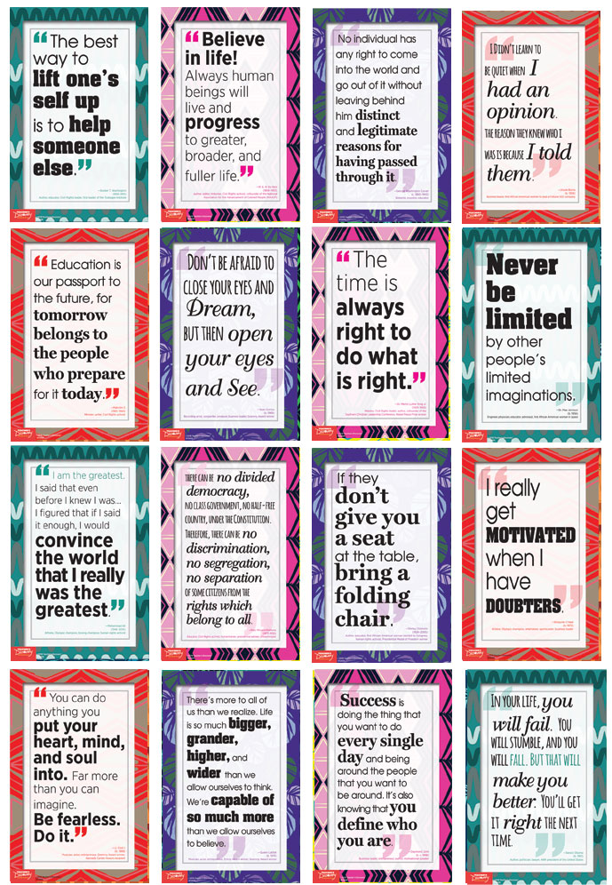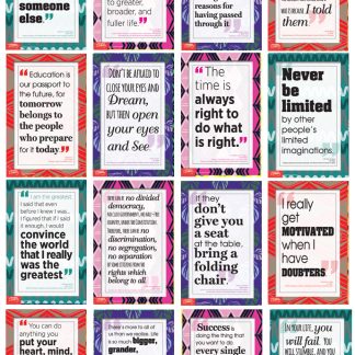 The voices of men and women of historical importance, government and business leaders, writers, athletes, and contemporary figures will inspire, challenge, and motivate students. Sixteen-poster set includes:Booker T. WashingtonW. E. B. Du BoisUrsula BurnsGeorge Washington CarverDr. Mae JemisonDr. Martin Luther King Jr.Malcolm XSean CombsMuhammad AliMary McLeod BethuneShaquille O’NealShirley ChisholmBarack ObamaDaymond JohnLL Cool JQueen LatifahCopyright 2018. All levels. 11 x 17. Cardstock.