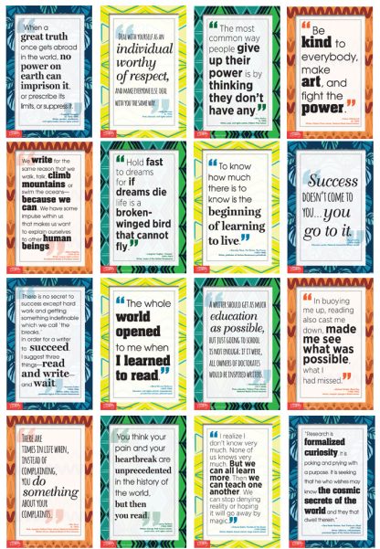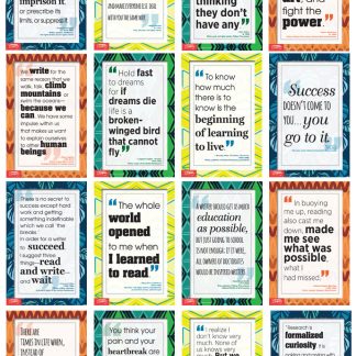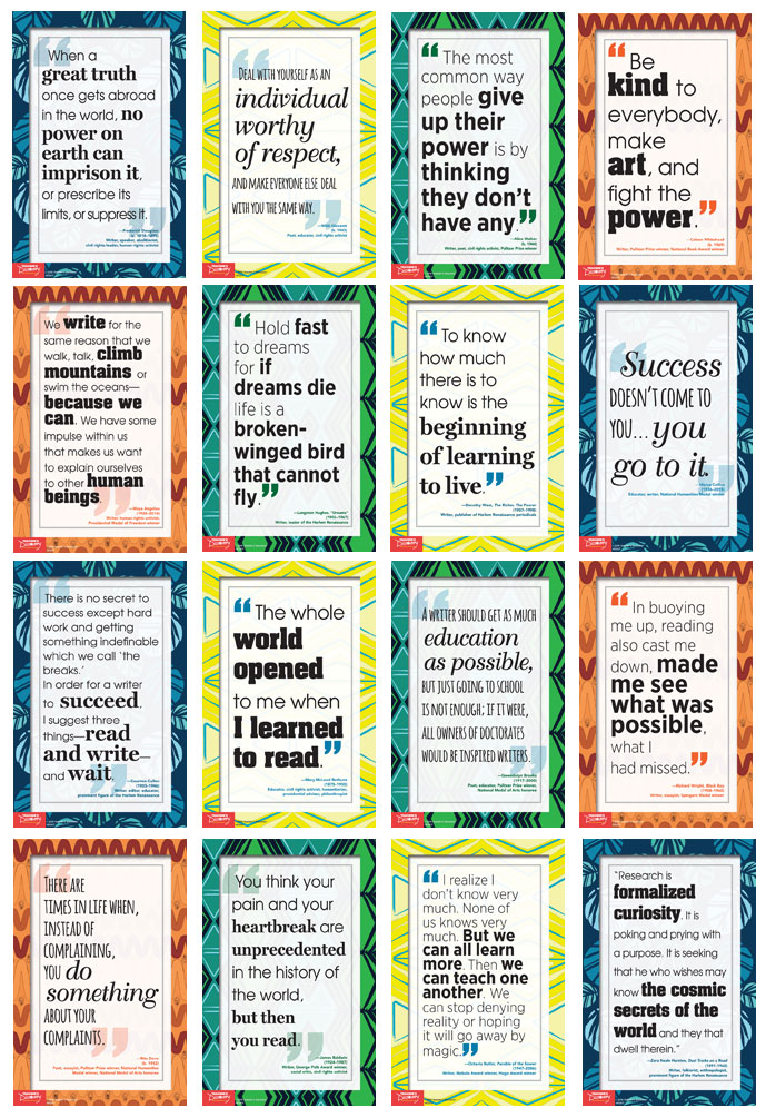 Let the voices of wisdom and experience speak to your students to inspire, motivate, and challenge.Includes quotes from contemporary and historical writers and educators :Colson WhiteheadAlice WalkerNikki GiovanniFrederick DouglassMaya AngelouLangston HughesDorothy WestMarva CollinsRichard WrightGwendolyn BrooksMary McLeod BethuneCountee CullenRita DoveJames BaldwinOctavia ButlerZora Neale HurstonCopyright 2018. Middle school, high school. Sixteen 11 x 17 posters. Cardstock, NOT laminated.