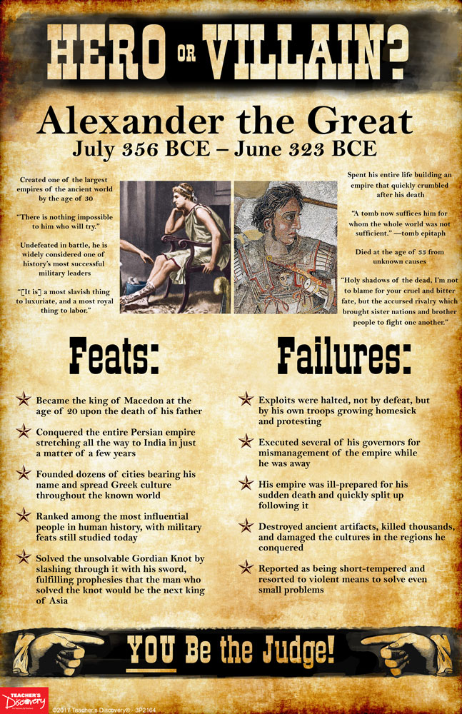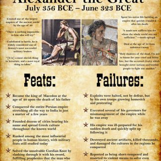 History tends to judge historical figures in extremes: Genghis Khan was a barbarian! Martin Luther was a religious hero! As teachers, it’s tempting at times to present the world as black and white to our students: good or evil, friend or foe, hero or villain. Use this Alexander the Great mini-poster to encourage students to take off the rose-colored glasses and see beyond the established historical narratives, into the real world of gray. Copyright 2017. 11 x 17 inches. Cardstock. Middle school, high school level.