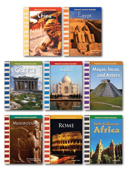Journey through history and explore the influence and contributions of key historical facts and figures, while reinforcing nonfiction reading skills with primary source readers. The engaging nonfiction text, striking graphics, and rich content-area material make these books perfect for teaching and learning!Primary Source Readers feature:High-interest nonfiction text and full-color graphicsHighlighted content-area vocabularySidebarsPhotographsGlossaryIndex and moreSoft cover, 32 pages, 7 x 9 inches.Reading level:span4-5/spanbr /Interest level:span5-8/spanspanbr //spanAncient Civilizations Primary Source Readers Set of 8 includes:3B1171 ;#126; Chinabr /3B1172 ;#126; Egyptbr /3B1173 ;#126; Greecebr /3B1174 ;#126; Indiabr /3B1175 ;#126; Mayas, Incas, and Aztecsbr /3B1176 ;#126; Mesopotamiabr /3B1177 ;#126; Romebr /3B1178 ;#126; Sub-Saharan Africa