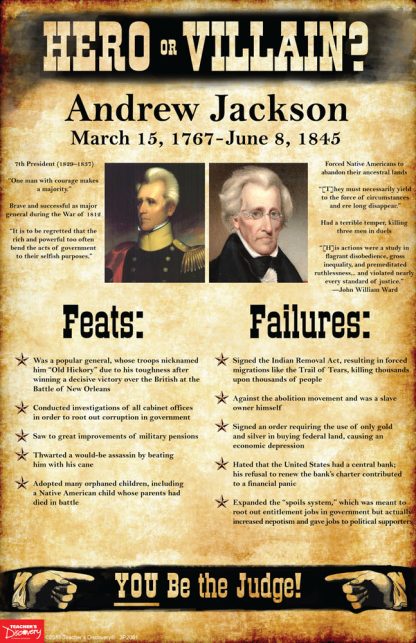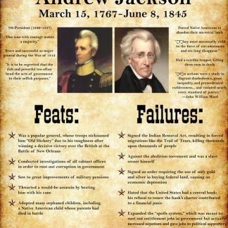 History tends to judge our past leaders as extremes: Benedict Arnold was a traitor! Abraham Lincoln was an American hero! As teachers, it’s tempting at times to present a world as black and white to our students: good or evil, friend or foe, hero or villain. Use this Andrew Jackson mini-poster to help students take off the rose-colored glasses and see beyond the established historical narratives and into the real world of gray. Copyright 2016. 11 x 17 inches. Cardstock.