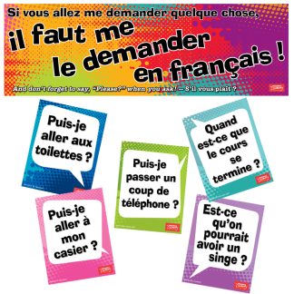 If They Have to Ask, Demand That They Ask in French!Help your students ask their top 10 questions in French. Our teachers’ poll reported the third most frequent query was for water. No. 2 on the list; asking for a pencil (or pen). I’ll bet you know what No. 1 is! This bulletin board set includes your humble request to say “please,” plus the top 10 questions printed on 8 x 11-inch cardstock. Not laminated.