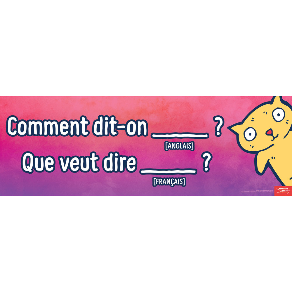 Students will need to ask for the meanings of French words that are new to them, and the French words for what they want to say–make sure they use French for both of these common questions! 13 x 38 inches. Laminated.
