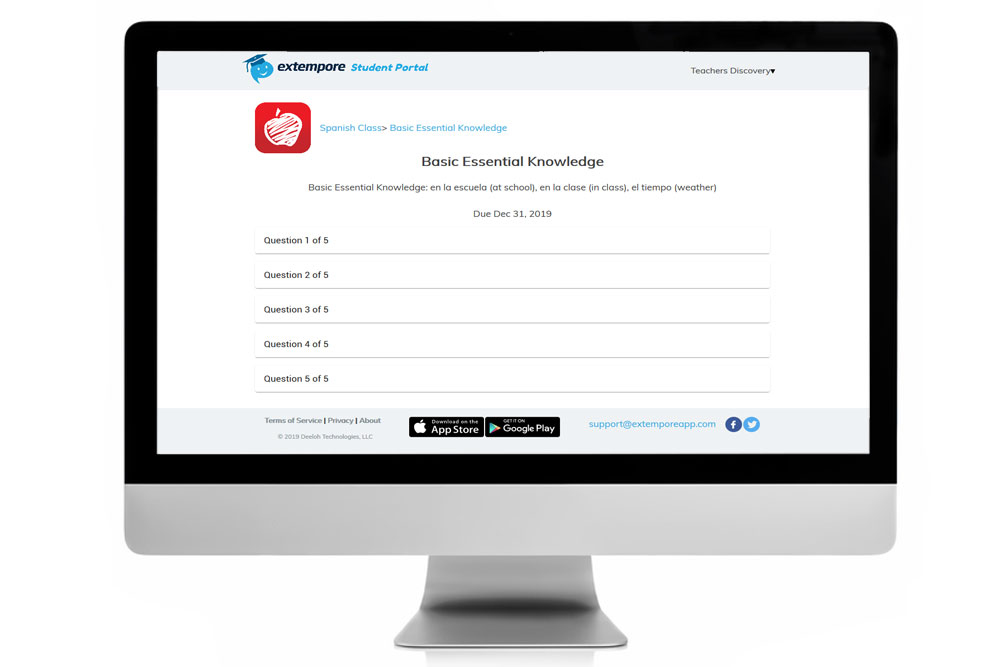 Save time by adding this Basic Essential Knowledge Oral Assessment to a class in your Extempore account. Assessment contains five questions with a mix of images and authentic Spanish audio to assess your students’ oral abilities. Once you purchase this Oral Assessment package, a link explaining how to add it to your classes in Extempore will be sent to you. It’s simple. Requires an Extempore subscription./Copyright 2019. Spanish. Level 1. Middle school, high school.Don’t Have the Extempore App?/ Try it for FREE ua “//store.extemporeapp.com/new/td” target=”_blank”here/a/u. Learn more about purchasing options a “//extemporeapp.com/how-to-buy/?from=td” target=”_blank”here/a.What Is the Extempore App?/br /With the Extempore app, you can create speaking assignments in minutes and assess your students’ Spanish spoken answers! Timers and other parameters allow you to control how spontaneous the response needs to be. Your students then submit video or audio responses on their phones, tablets, or computers. You can grade the assessments on your computer or on the go, creating a digital portfolio to track each student’s performance. If you don’t already have the app, learn more ua “//landing.extemporeapp.com/what-is-extempore-td” target=”_blank”here/a/u.