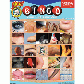 New images, bigger-than-ever cards, updated word listsdash;everything you asked for! Bingo games help reinforce 32 topic-related vocabulary words. The game cards are a full 8 x 11 inches with 24 pictures and a free space in the middle. The call-out sheet doubles as a study guide for the students. Languages include English, Spanish, French and German; plus, a blank line to add your own language. They are made with environment-friendly cardstock and include a reclosable plastic envelope for storage. 36 game cards.br / br /