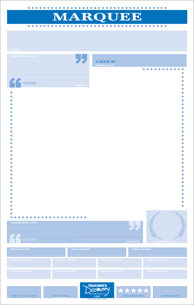 Poster-board movie marquee activity requires each student to respond, research, and critically think about the novels they have read. Generous space is provided for students to draw, create a collage, or a bit of both, as they recall and represent symbols, motifs, and themes of the work.Poster asks for: the title and author a significant quotation from the text a quotation from a review of the work a listing of primary and secondary characters an award, honor, or prize received given the author for the book the original date of publication the Lexile score a star rating of the book from the studentPerfect for student projects, presentations, and classroom display!Copyright 2017. Set of 30 posters. Middle and high school. 14 x 22 inches. Cardstock.