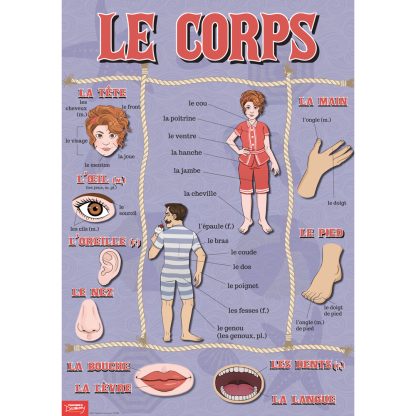 La t;ecirc;te, l’;eacute;paule, le genou, le doigt de pied/–teach the parts of the body with a fun “old-timey” beach theme! Copyright 2017. 19 x 27 inches. Laminated.