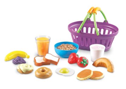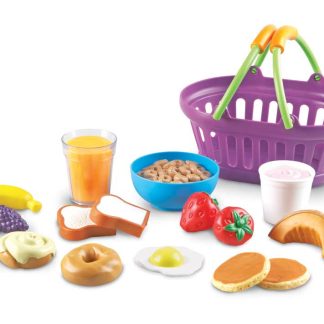 Freshly designed breakfast foods are made of soft, durable plastic, and easy to wash or wipe clean.Set includes an oval basket measuring approximately 8.5″L x 7″W x 4″H Pieces include: egg, glass of juice, berries, cinnamon roll, banana, strawberries, pancakes, cereal in a bowl, yogurt, melon wedge, bread and mini bagel.