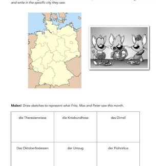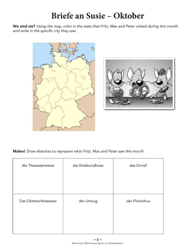 Peter (an American mouse) visits Germany and stays with Fritz in Munich. The two go to school, but also travel throughout Germany and experience different aspects of German culture. Every month Fritz writes a letter to Susie (their friend in Maine), telling her about his many adventures traveling to visit King Ludwig;#39;s castle, Mozart;#39;s house in Salzburg and the Oktoberfest. Engaging cartoon illustrations by artist Peter Tracy depict Peter, Fritz and friends dining onWiener Schnitzel/emand pretzels, enjoying themselves in Bavaria, mountain-climbing, visiting a museum and having a good mouse time! This German reader is written in the past tense, since this is an important grammar point taught in a second-year German class. Each chapter inBriefe an Susie/emincludes content questions, and there is a complete German-English glossary at the end of the book. Level 2br /Unique Words: extensivebr /Tense(s): multiplebr /Glossary: yesCopyright 2010. German. Level 2. 67 pages. Print Book: 5 x 7 inches. Softcover. The Activity Packet aligns to the reader. Includes chapter-by-chapter questions, fill-in-the-blank activities, crossword puzzles, map activities, and more. Copyright 2013. English. German. Level 2. Reproducible. 24 pages + answer key. Activity Packet Download: PDF. Adobe Reader required to view PDF. Print Activity Packet: Loose-leaf paper. 8 x 11 inches. img alt=”” src=”//aedownload.net/teachersdiscovery/images/Fabiola_Canale_German_Reader.jpg” style=”float: left; border-width: 0px; border-style: solid; margin: 0px 6px; height: 135px; padding-right: 10px;” /About the Author Fabiola Canale/ was raised by German parents living in Venezuela. She has lived all over the United States, and currently resides in Colorado. She has been teaching and writing stories for her students for many years. While she truly loves cooking, reading, and watching TV, her favorite free-time activities are working out and hiking with her husband. She wishes she could live in Maine, just like the mice in her books.