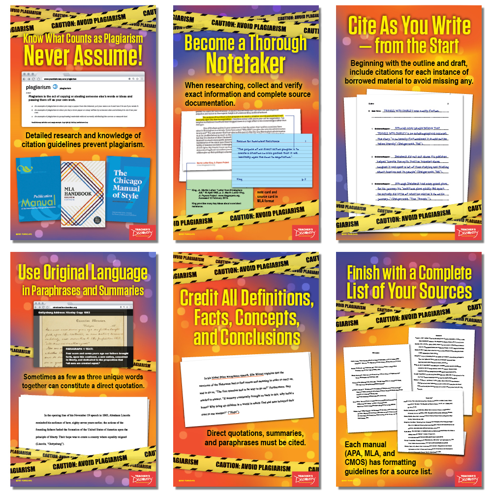 Plagiarism is a constant topic of concern when students are learning the ins and outs of research paper writing. Present the basics with easy to follow examples that look just like the documents that are being used by students. Each poster provides a winning rule and illustrates it with an example Source list poster shows seven sources in three formats Set specifically addresses APA, MLA, and CMOS current formatsMini-Poster Set: Copyright 2018. Set of 6 posters. 13 x 21 inches. Cardstock.Projectable Download: Copyright 2018. PDF. Adobesup/sup Readersup/sup required to view PDF. 6 pages.