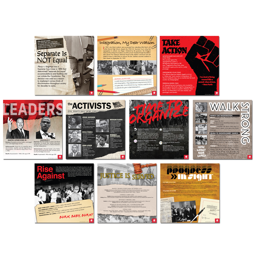 Who were the activists? What progress was made? Why did we riot? How was justice served? Fast facts on key leaders Important events and Supreme Court cases Examples of non-violent protests And more on how the Civil Rights Movement continues to affect society todayTen 12 x 12-inch mini-posters. Cardstock. Middle school, high school.