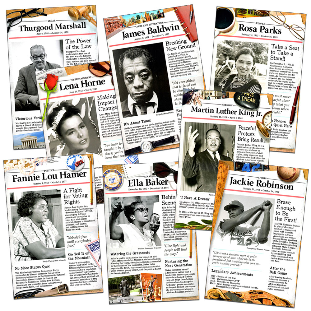Introduce students to some of the most influential individuals of the Civil Rights era. This set features African Americans whose leadership and courageous actions energized the nation, and launched the movement toward justice and equality for all U.S. citizens.This set features:Martin Luther King, Jr.Rosa ParksJames BaldwinLena HorneElla BakerThurgood MarshallFannie Lou HamerJackie RobinsonCopyright 2013. Eight 11 x 17 inch posters. Middle/high school level.