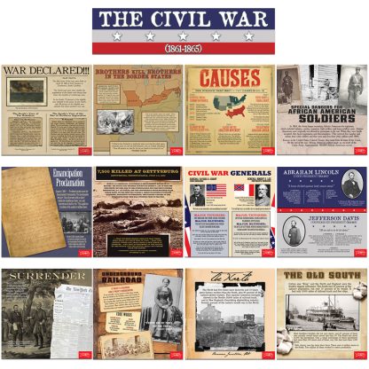 Twelve posters show the who, what, where, when and why of the Civil War in a new and eye-catching way. From the causes of war and epic battles to the Underground Railroad and the Border States, this poster set has it all.Each mini-poster measures 12 x 12 inches, and the banner measures 6 x 24 inches. Printed on glossy card stock. Middle/high school. Sold only as a set.