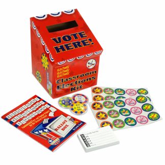 This kit includes a pre-assembled ballot box, ballots, campaign buttons, and everybody’s favorite–voting stickers! Also includes an activity book filled with election facts and exercises. Hold mock elections for the president and other elected officials Vote for student council and club officers Make any class decision!Copyright 2007. Ballot box measures 7 x 7 x 9 inches. One-hundred 2 x 4-inch ballots, three 2-inch buttons, thirty 1-inch stickers. Book measures 5 x 9 inches. Softcover, 48 pages.