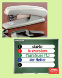 New images, bigger-than-ever cards, updated word listsdash;everything you asked for! Flash cards and bingo games with 32 topic-related vocabulary words. The flash cards are a full 8 x 11 inches with vocab in English, Spanish, French and German; plus a blank space to add your own language on the back. We’ve even included a reproducible study sheet for the students. The bingo games are 8 x 11 inches and include 36 full-color game cards. Bingo images are over 1 inch square and have the classic free space in the middle, great for reinforcement. Includes an envelope for storage. 36 game cards.br /br /Classroom nouns vocabulary includes: backpack, lunch, bookcase, books, calculator, calendar, CD player, clock, computer, desk, mouse, flag, file folder, globe, glue, grade, hole puncher, homework, map, markers, spiral notebook, paper clip, pen, pencil sharpener, pencil, projector, ruler, scissors, sleeping student, stapler, wastebasket and whiteboard.br /