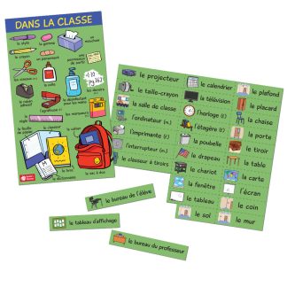 Provide your students with the nouns for things commonly found in the classroom, from the school supplies they are always asking for, to words like ;ldquo;wall,;rdquo; ;ldquo;door,;rdquo; ;ldquo;projector,;rdquo; and ;ldquo;bulletin board.;rdquo; Small items are all shown on one poster. For the big things, just cut out the labels and tape them up around the classroom!French. Poster is 15 x 26 inches, sheet of labels is 26 x 22 inches. Both are laminated.