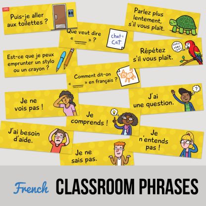 Whether they’re requesting that you speak more slowly, announcing their “Aha!” moment, or posing the #1 question of students everywhere–“Can I go to the bathroom?”–these easy-to-read illustrated signs help keep students in the target language! Twelve 7 x 19-inch posters. Cardstock.