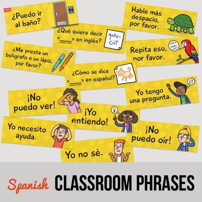 Whether they’re requesting that you speak more slowly, announcing their “Aha!” moment, or posing the #1 question of Spanish students everywhere–“Can I go to the bathroom?”–these easy-to-read illustrated signs help keep students in the target language! Twelve 7 x 19-inch posters. Cardstock.