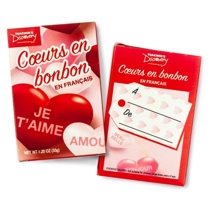 Your students will love these classic Valentine’s Day candy hearts even more now that they’re in French! Give a box to every student. Choose from a 36-box set or 108-box set. Each 1.25 oz. box contains approximately 33 hearts in six assorted colors.Allergy Information: Product is manufactured in a facility that also processes peanuts, tree nuts, wheat, soy, milk, and eggs.