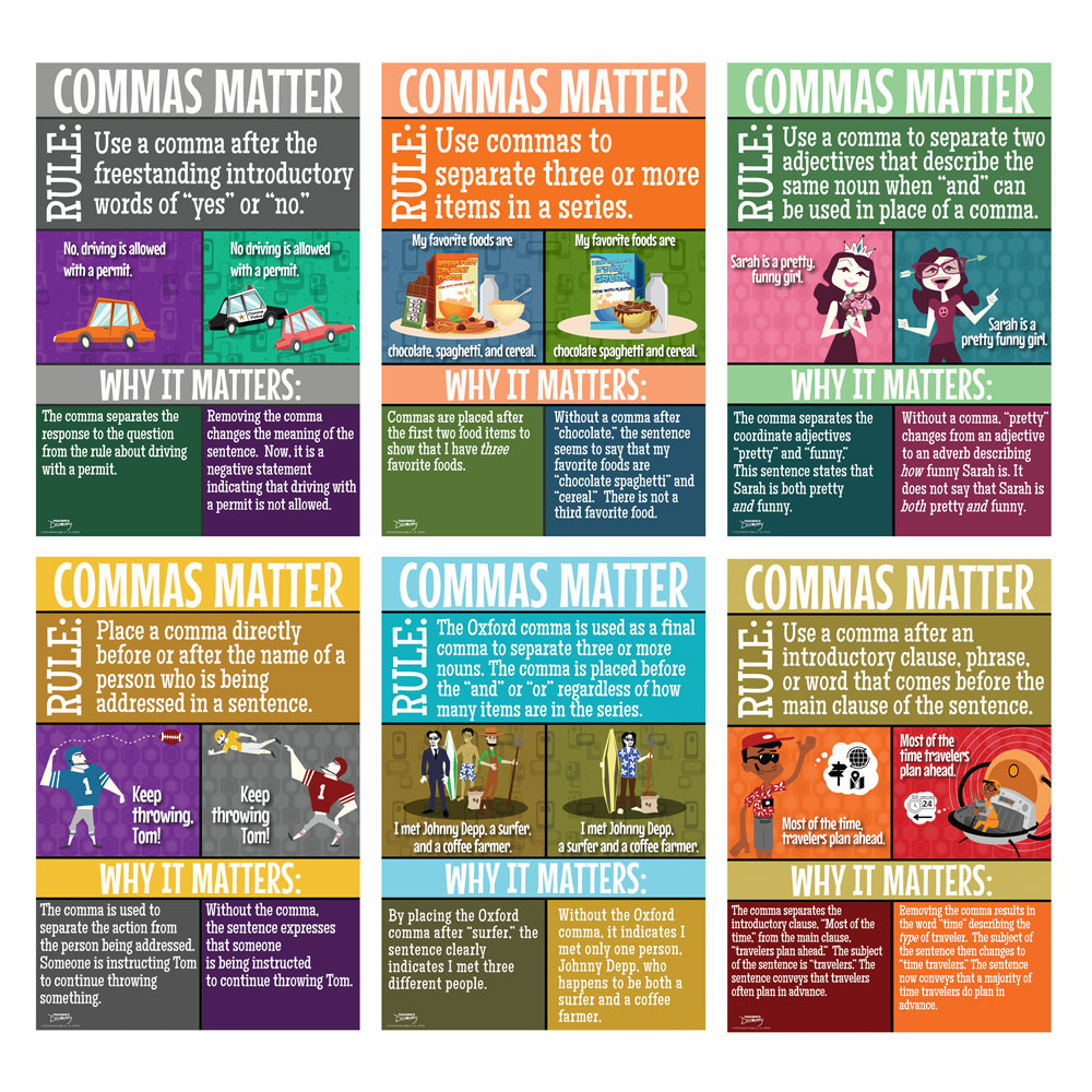 The Commas Matter poster set introduces six different comma rules. Each poster has two versions of the same sentence–one with a comma and one without. The meanings of those sentences change drastically, most often in a comical way, as illustrated through these funny, retro-themed images. Included are simple explanations for your students as to why a comma is necessary in each sentence.Copyright 2019. Set of six posters. Middle school, high school. 13 x 19 inches each. Cardstock.