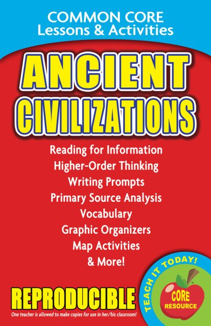 Meet the new Common Core State Standards for ELA as well as Literacy and Writing in History and Social Studies! This book is designed to supplement your Social Studies resources, adding new Common Core rigor, analysis, writing inference, text-dependent questions, and more into your daily instruction. br /Here’s how it works!Work through the lessons and activities as a class to teach your students higher-order thinking, analysis, and the 21st-century skills necessary to meet new Common Core State Standards expectations.Allow students to work through the lessons independently to build and practice these new skills.Include technology, collaboration, presentations, and discussion in the activities as you desire–you can decide how in-depth to go.Watch your class develop new abilities to meet the rigor of Common Core State Standards, right before your eyes!Ancient Civilizations–Common Core Lessons and Activities includes:Reading for InformationHigher-Order ThinkingWriting ProblemsPrimary Source AnalysisVocabularyGraphic OrganizersMap Activities and More!Tips for using and reproducing the book pages:Use some of the pages–or use them all–based on your grade, your students, your curriculum, and your needs.Use these pages at their current size, or if you prefer them to be 8.5 x 11 inches, enlarge them 125% on your copy machine.Use the CCSS correlations grid to easily see which Common Core standards are covered in each lesson.Copyright 2015. Middle School. 5 x 8 inches. Reproducible. Softcover, 24 pages.br /ISBN: 978-0-635-11986-5