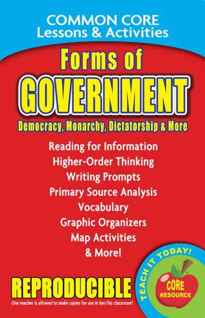 span style=”font-size: medium;”Form of Government – Common Core Lessons and Activities book/spanMeet the new Common Core State Standards/em for ELA as well as Literacy ;amp; Writing in History and Social Studies! This book is designed to supplement your Social Studies resources, adding new Common Core rigor, analysis, writing inference, text-dependent questions and more into your daily instruction. Copyright 2013. 24 pages. Middle/high school levels.span style=”font-size: small;”Here’s how it works!/spanWork through the lessons and activities as a class to teach your students higher-order thinking, analysis, and 21st century skills necessary to meet new Common Core State Standards expectations.Allow students to work through the lessons independently to build and practice these new skills.Include technology, collaboration, presentations, and discussion in the activities as you desire – you can decide how in-depth to go.Watch your class develop new abilities to meet the rigor ofCommon CoreState Standards, right before your eyes!span style=”font-size: small;”Forms of Government – Common Core Lessons and Activities includes:/spanReading for InformationHigher-Order ThinkingWriting ProblemsPrimary Source AnalysisVocabularyGraphic OrganizersMap Activities ;amp; More!span style=”font-size: small;”Tips for using and reproducing the book pages:/spanUse some of the pages – or use them all – based on your grade, your students, your curriculum, and your needs.Use these pages at their current size, or if you prefer them to be 8.5 X 11 inches, enlarge them 125% on your copy machine.Use the CCSS correlations grid to easily see whichCommon Corestandards are covered in each lesson.Copyright 2013. Soft cover, 24 pages, 8-1/2 x 5-1/4, reproducible. Middle/high school.ISBN:978-0-635-10620-9Table of Contents include:What is Government: Reading Informational Textbr /Limited ;amp; Unlimited Powers: Classifying Informationbr /Forms of Government Prefixes and Suffixes: Vocabularybr /Forms of Democracy: Reading Informational Textbr /Athenian ;amp; U.S. Democracy:Compare ;amp; Contrastbr /Forms of Monarchy:Compare ;amp; Contrastbr /Protecting Citizens’ Rights:Summarizing Informationbr /Monarchs and Peasants:Primary Source Analysisbr /Democratic Revolution:Cause ;amp; Effectbr /Government Characteristics:Graphic Organizerbr /Dictatorship:Inferencebr /Dictator Quotations:Comparison of Primary Sourcesbr /Forms of Oligarchy:Main Ideabr /Government on the Bus:Applying Conceptsbr /Voter Responsibility:Point of Viewbr /More Forms of Government!:Classifying Informationbr /Mapping Democracy:Map Activitybr /Systems of Government:Reading Informational Textbr /&gtame that Government!:Primary Source Analysisbr /Common Core State Standards Correlations