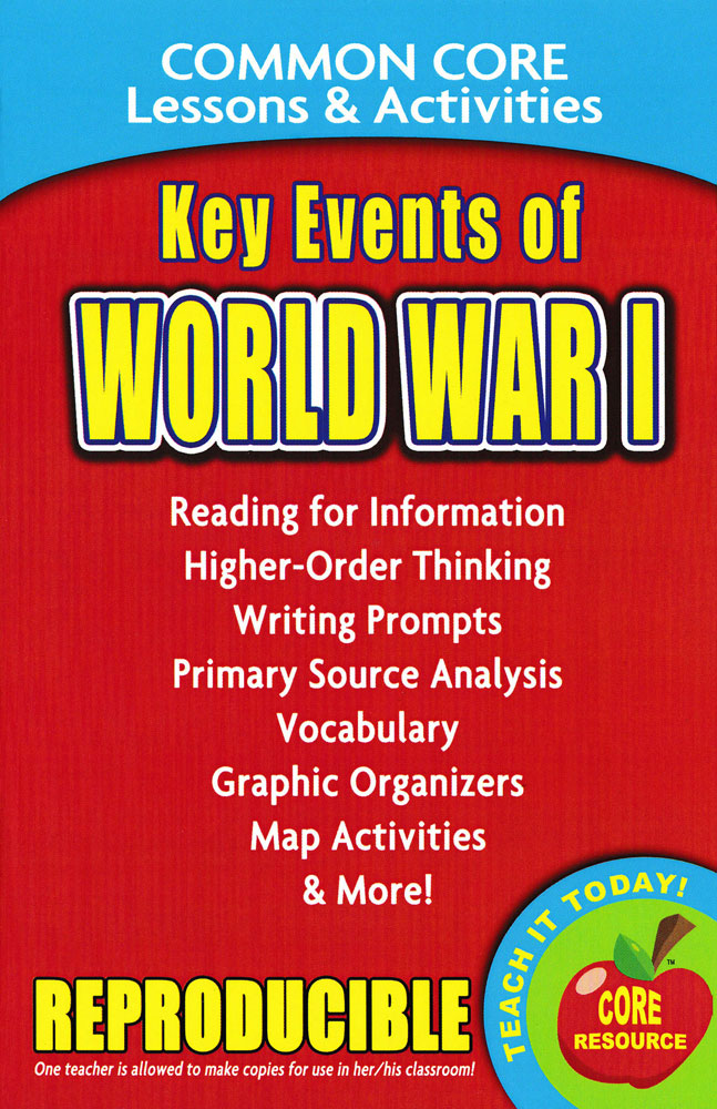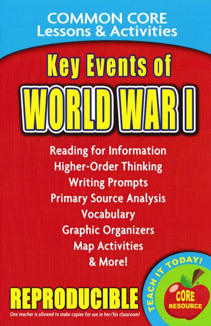 Meet the new Common Core State Standards for ELA as well as Literacy and Writing in History and Social Studies! This book is designed to supplement your Social Studies resources, adding new Common Core rigor, analysis, writing inference, text-dependent questions, and more into your daily instruction. br /Here’s how it works!Work through the lessons and activities as a class to teach your students higher-order thinking, analysis, and the 21st-century skills necessary to meet new Common Core State Standards expectations.Allow students to work through the lessons independently to build and practice these new skills.Include technology, collaboration, presentations, and discussion in the activities as you desire–you can decide how in-depth to go.Watch your class develop new abilities to meet the rigor of Common Core State Standards, right before your eyes!Key Events of World War I–Common Core Lessons and Activities includes:Reading for InformationHigher-Order ThinkingWriting ProblemsPrimary Source AnalysisVocabularyGraphic OrganizersMap Activities and More!Tips for using and reproducing the book pages:Use some of the pages–or use them all–based on your grade, your students, your curriculum, and your needs.Use these pages at their current size, or if you prefer them to be 8.5 x 11 inches, enlarge them 125% on your copy machine.Use the CCSS correlations grid to easily see which Common Core standards are covered in each lesson.Copyright 2015. Middle School. 5 x 8 inches. Reproducible. Softcover, 24 pages.br /ISBN: 978-0-635-11985-8