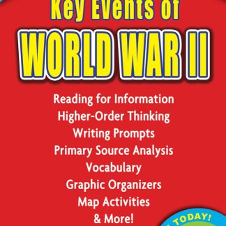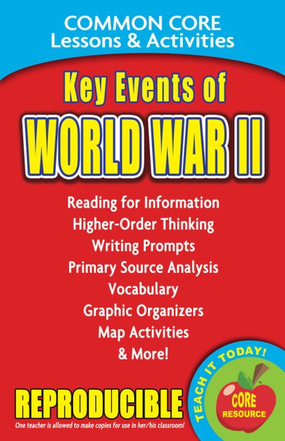 span style=”font-size: medium;”Key Events of the World War II – Common Core Lessons and Activities book/spanMeet the new Common Core State Standards/em for ELA as well as Literacy ;amp; Writing in History and Social Studies! This book is designed to supplement your Social Studies resources, adding new Common Core rigor, analysis, writing inference, text-dependent questions and more into your daily instruction. Copyright 2013. 24 pages. Middle/high school levels.span style=”font-size: small;”Here’s how it works!/spanWork through the lessons and activities as a class to teach your students higher-order thinking, analysis, and 21st century skills necessary to meet new Common Core State Standards expectations.Allow students to work through the lessons independently to build and practice these new skills.Include technology, collaboration, presentations, and discussion in the activities as you desire – you can decide how in-depth to go.Watch your class develop new abilities to meet the rigor ofCommon CoreState Standards, right before your eyes!span style=”font-size: small;”Key Events of the World War II – Common Core Lessons and Activities includes:/spanReading for InformationHigher-Order ThinkingWriting ProblemsPrimary Source AnalysisVocabularyGraphic OrganizersMap Activities ;amp; More!span style=”font-size: small;”Tips for using and reproducing the book pages:/spanUse some of the pages – or use them all – based on your grade, your students, your curriculum, and your needs.Use these pages at their current size, or if you prefer them to be 8.5 X 11 inches, enlarge them 125% on your copy machine.Use the CCSS correlations grid to easily see which Common Core standards are covered in each lesson.divCopyright 2013. Soft cover, 24 pages, 8-1/2 x 5-1/4, reproducible. Middle/high school.ISBN:978-0-635-10585-1/divspan style=”font-size: small;”Table of Contents include:/spanp style=”padding-left: 30px;”World War II Begins: Reading Informational Textbr /Chamberlain’s Speech: Primary Source Analysisbr /Leaders of World War II: Main Idea Organizer br /Axis-Occupied Europe: Map Activitybr /World War II Vocabulary: Vocabulary br /Attack on Pearl Harbor: Primary Source Analysisbr /Day in Infamy Speech: Primary Source Analysisbr /Rationing in the U.S.: Problem-Solution-Results br /Dig on for Victory: Primary Source Analysisbr /World War II: Causes, Events, ;amp; Effects br /Rosie the Riveter: Primary Source Analysisbr /Tuskegee Airmen: Reading Informational Textbr /D-Day: Primary Source Analysisbr /Iwo Jima: Primary Source Analysisbr /The Holocaust: Reading Informational Text ;amp; Writingbr /United Nations: Cause and Effectbr /VE ;amp; VJ Days: Reading Informational Textbr /Key Events of World War II: Chronological Events br /Atomic Bomb Decision: Primary Source Analysisbr /Common Core State Standards Correlationsbr /