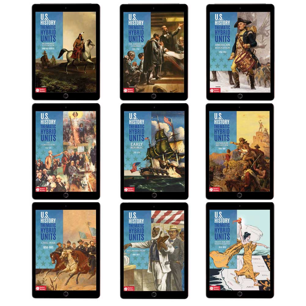 U.S. History Thematic Hybrid Units are an entire digital curriculum in one place! PDFs include complete teacher edition and editable student pages. Students simply type their answers in, save, and upload. Printable and projectable, these units are perfect for seamless teaching in class, at home, or any combination! Flexible design works in any learning environment, ready to upload to Google Classroom or any other learning platform! Differentiated with a solid mix of activities, content and skills practice, graphic organizers, primary source analysis and DBQs, warmups, mapping, historic speech analysis, and resources. Out-of-the-box activities such as simulations, easy debates, creative writing, challenge and clue activities, mock trials, and persuasion stations! Ready to implement! No textbook, no problem. A historical context reading with bolded key vocab terms starts each unit. Aligned to C3 and Common Core national standards. Middle school, high school. Reproducible. Set of nine PDF downloads, 65dash;116 pages. U.S. History Thematic Hybrid Unit Curriculum Set Includes: U.S. History Thematic Hybrid Unit: Beginnings to Colonization Download (3U0001DL) U.S. History Thematic Hybrid Unit: The American Colonies Download (3U0002DL) U.S. History Thematic Hybrid Unit: American Revolution Download (3U0003DL) U.S. History Thematic Hybrid Unit: The Constitution Download (3U0004DL) U.S. History Thematic Hybrid Unit: Early Republic Download (3U0005DL) U.S. History Thematic Hybrid Unit: Expansion and Reform Download (3U0006DL) U.S. History Thematic Hybrid Unit: Civil War Download (3U0007DL) U.S. History Thematic Hybrid Unit: Reconstruction Download (3U0008DL) U.S. History Thematic Hybrid Unit: Gilded Age and Industrialization Download (3U0009DL)