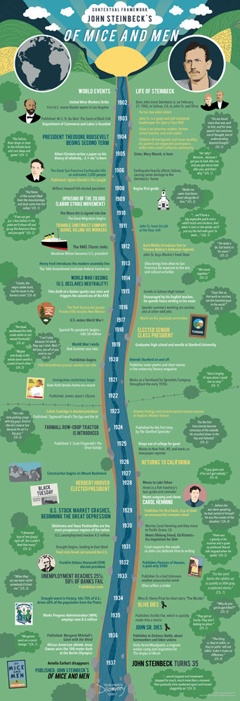 Poster Shows:Historical world events that occurred during the author’s early lifeKey events of John Steinbeck’s life before the publication of Of Mice and Men/ Selected quotations from Of Mice and Men/Copyright 2017. 13 x 38 inches. Laminated.img alt=”” src=”//aedownload.net/teachersdiscovery/images/Author_Allison_Peterson.jpg” style=”float: left; border-width: 0px; border-style: solid; margin: 0px 6px; height: 170px; padding-right: 10px;” /About the AuthorAllison Peterson has long loved reading, writing, and helping others. While earning her undergraduate degree at Michigan State University, deciding to pursue a degree in secondary English education was easy. Twelve years later, teaching has taken her from Michigan to Colorado to the Republic of Kosovo, and now, to Vietnam. Living abroad has allowed for extensive travel–29 countries and counting. Allison seeks out adventures involving the outdoors, cooking, language, and other new experiences. In December 2016, Allison completed a master’s degree in Educational Leadership from Western Michigan University, and has since transitioned from classroom teaching to workplace development and training. Allison has been a freelance curriculum writer for four years and enjoys sharing the skills she honed as a teacher with other teachers, and focusing on fostering student agency and enthusiasm toward the curriculum.
