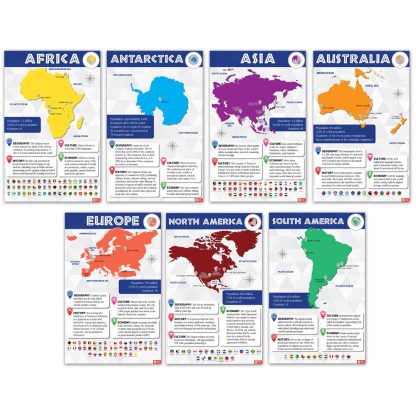 Do you know which continent is home to 138 volcanoes? Learn this unique fact and more with details about each continent. Analyze the population, number of countries and major cities Be informed with categories on geography, history, culture and the economy Compare and contrast the continent’s size and shape with one another Explore the flags of each country located in that continentspan style=”color:#FF0000;”Download the free Teachable Moments located in “Additional Info.”/spanSeven 14 x 22 inch posters. Laminated. All Levels. Sole Source.