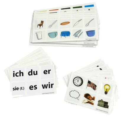 Get clings for your cubes! Each reusable cling fits perfectly on our three-inch Erasable Cool Cubes. Sentence Starter Cling Set includes 9 pronoun clings, 24 infinitive verb clings, and 6 interrogative clings. Vocabulary Cling Set includes 16 topics, 10 clings per topic. Story Cling Set includes 54 noun and 54 verb clings. Copyright 2019. German. Clings measure 3 x 3 inches.