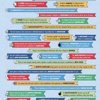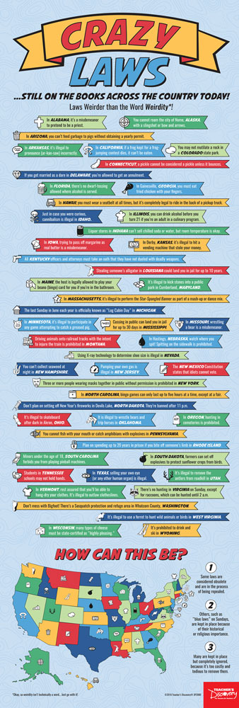 In Florida, there’s no dwarf-tossing allowed where alcohol is served. Stealing someone’s alligator in Louisiana could land you in jail for up to 10 years. Selling your own eye (or any other human organ) is illegal in Texas.Why were these laws ever needed? Are they still enforced today? This poster features one law per state with an accommodating icon map. These crazy, but REAL, laws make for excellent discussion starters in any classroom! Copyright 2016. 13 x 38 inches. Laminated to last. Middle school, high school.