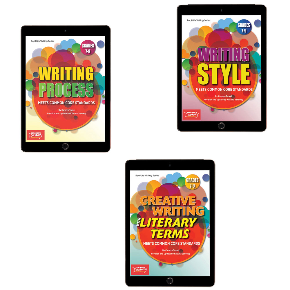 Help students become better, stronger writers using this set of writing books! Setincludes one of each of the following:Creative Writing with Literary Terms;/emWriting Process/em; andWriting Style/em.Creative Writing with Literary Terms/ starts with the basics and progressively moves students through the writing process with examples, exercises, and group and individual activities. Reproducible, engaging worksheets cover style, figurative language, genre writing, and much more. Charts and organizers make writing exercises interesting and fun! Answer keys make your life easier!Copyright 2015. English. Middle school, high school.Reproducible. 100 pages.Good writers are made, not born, and you’re the teacher to help make them! Writing Style/ covers organization, voice, how to generate exciting ideas, fluency, and much more. Every section features a graphic organizer for greater engagement. Interesting exercises challenge kids, and help them practice skills.Copyright 2015. English. Middle school, high school.Reproducible.80 pages.From prewriting to the final draft, Writing Process/ shows students how to become stronger writers. Overviews cover what students need to know, and exercises and activities help them apply their skills. Individual and group writing activities engage students. Includes Common Core Standards for quick reference.Copyright 2015. English. Middle school, high school.Reproducible.76 pages.Books Download Set: ThreePDFs.Adobe Reader required to view PDFs. Print Books Set:Three print books.Spiral-bound. 8 x 11 inches.img alt=”” src=”//aedownload.net/teachersdiscovery/images/Author_Kris_Janeway.jpg” style=”float: left; border-width: 0px; border-style: solid; margin: 0px 6px; height: 150px;” /About the AuthorKristina Janeway / is a Pre-AP, GT, and PSAT/Pre-AP English teacher at Terra Vista Middle School in Lubbock, Texas. In her 21-year career, Kristina has had 19 years of experience working with gifted and talented students, as well as Pre-AP, AP, and full-inclusion students in the West Texas area. She has written curriculum for grades seven through twelve, designed an academic vocabulary course for the high school, designed a Pre-AP/PSAT English course for eighth graders, designed a SAT/ACT course for seventh graders in the Duke University Talent Search Program, and designed the seventh and eighth grade GT course.Kristina completed a master’s degree in Education Administration and holds a Principal’s Certificate. Kristina was the recipient of the Frank and Nancy Newton’s Excellence in Education Award from the Beaumont Foundation in 2010, and the Panhandle South Plains TAGT Teacher of the Year Award for 2014.
