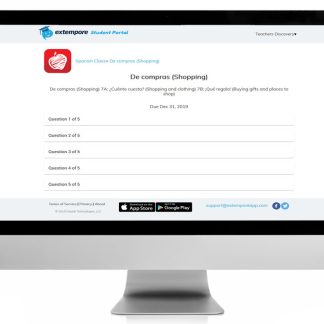 Save time by adding this De compras/ Oral Assessment to a class in your Extempore account. Assessment contains five questions with a mix of images and authentic Spanish audio to assess your students’ oral abilities. Once you purchase this Oral Assessment package, a link explaining how to add it to your classes in Extempore will be sent to you. It’s simple. Requires an Extempore subscription./Copyright 2019. Spanish. Level 1. Middle school, high school.Don’t Have the Extempore App?/ Try it for FREE ua “//store.extemporeapp.com/new/td” target=”_blank”here/a/u. Learn more about purchasing options a “//extemporeapp.com/how-to-buy/?from=td” target=”_blank”here/a.What Is the Extempore App?/br /With the Extempore app, you can create speaking assignments in minutes and assess your students’ Spanish spoken answers! Timers and other parameters allow you to control how spontaneous the response needs to be. Your students then submit video or audio responses on their phones, tablets, or computers. You can grade the assessments on your computer or on the go, creating a digital portfolio to track each student’s performance. If you don’t already have the app, learn more ua “//landing.extemporeapp.com/what-is-extempore-td” target=”_blank”here/a/u.