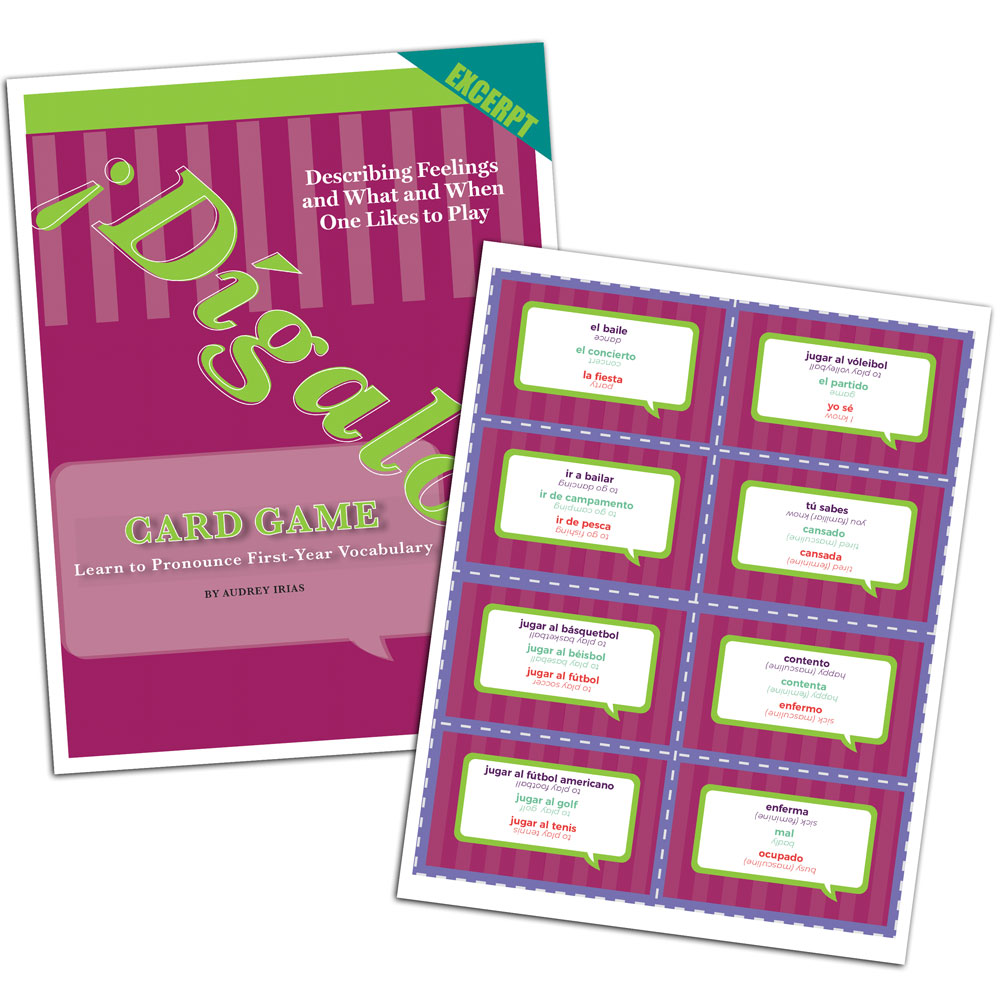 D;iacute;galo/em is a game that enables students to simultaneously practice pronunciation and memorize vocabulary. On one side of the card is a phonetic version of a common expression, if not a whole sentence, associated with the theme of this chapter, chosen to simulate how one would use words and conjugate verbs in that context. On the other side is the actual Spanish version that the student’s teammates will guess, and the English equivalent, upside-down. Vocabulary inspired by the Realidades/em textbook series by Pearson. Some assembly required upon printing.This download includes: Instructions A pronunciation guide A flash card key, also unique by color to this chapter A reference guide unique to this chapter Playing cards, with up to eight cards per sheet, that print exactly back-to-backCopyright 2018. English, Spanish. Beginning. Middle school, high school. Reproducible. Download. PDF, Adobe Acrobat Reader DC required to view PDF. 14 pages. img alt=”” src=”//aedownload.net/teachersdiscovery/images/Author_Audrey_Irias.jpg” style=”float: left; border-width: 0px; border-style: solid; margin: 0px 6px; height: 135px; padding-right: 10px;” /About the Author Audrey Yates Irias started learning Spanish at age 10 in a FLEX program in her elementary school, because her aunt lived in Puerto Rico. She was so enamored with learning languages that she dove in head first, and took multiple years of Spanish and French in high school. Following her passion, she was a double major in Spanish and French Education and a TESOL minor, at Illinois State University–during which time she studied in Spain and France. She taught for 11 years in both traditional as well as virtual classrooms. In 2016, she earned her master’s in Translation and Interpreting from the University of Illinois.Audrey enjoys spending time with her daughter, dancing, teaching students one-on-one, and developing curriculum that benefits students and teachers of World Languages.