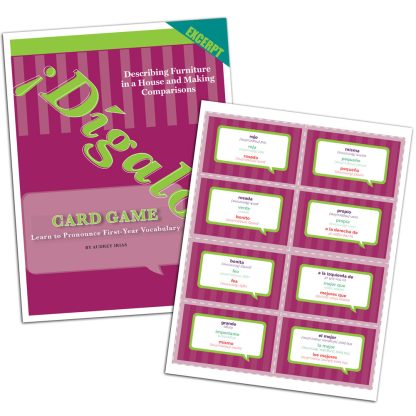 D;iacute;galo/em is a game that enables students to simultaneously practice pronunciation and memorize vocabulary. On one side of the card is a phonetic version of a common expression, if not a whole sentence, associated with the theme of this chapter, chosen to simulate how one would use words and conjugate verbs in that context. On the other side is the actual Spanish version that the student’s teammates will guess, and the English equivalent, upside-down. Vocabulary inspired by the Realidades/em textbook series by Pearson. Some assembly required upon printing.This download includes: Instructions A pronunciation guide A flash card key, also unique by color to this chapter A reference guide unique to this chapter Playing cards, with up to eight cards per sheet, that print exactly back-to-backCopyright 2018. English, Spanish. Beginning. Middle school, high school. Reproducible. Download. PDF, Adobe Acrobat Reader DC required to view PDF. 19 pages. img alt=”” src=”//aedownload.net/teachersdiscovery/images/Author_Audrey_Irias.jpg” style=”float: left; border-width: 0px; border-style: solid; margin: 0px 6px; height: 135px; padding-right: 10px;” /About the Author Audrey Yates Irias started learning Spanish at age 10 in a FLEX program in her elementary school, because her aunt lived in Puerto Rico. She was so enamored with learning languages that she dove in head first, and took multiple years of Spanish and French in high school. Following her passion, she was a double major in Spanish and French Education and a TESOL minor, at Illinois State University–during which time she studied in Spain and France. She taught for 11 years in both traditional as well as virtual classrooms. In 2016, she earned her master’s in Translation and Interpreting from the University of Illinois.Audrey enjoys spending time with her daughter, dancing, teaching students one-on-one, and developing curriculum that benefits students and teachers of World Languages.