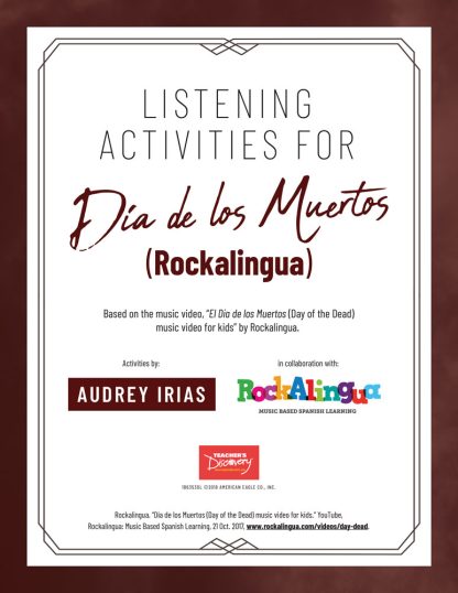 Talk about why those who celebrate D;iacute;a de los Muertos/em do what they do ;ldquo;para recordar/em, para celebrar a los que ya no est;aacute/em,;rdquo; as they sing in the song. In collaboration with Rockalingua, we bring you a packet with eight different listening activities to use at the elementary and/or Spanish 1 level. These activities will be great for your visual, auditory, and spatial learners, as they put events in order, work on their listening skills, and draw.Copyright 2018. English, Spanish. Beginning. Reproducible. 8.5 x 11 inches. Download. PDF. 12 pages. PDF requires Adobe Reader to view.