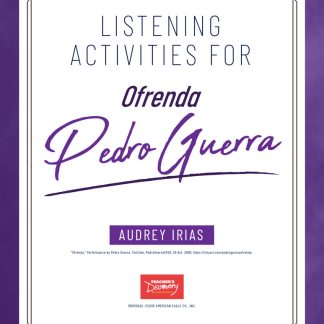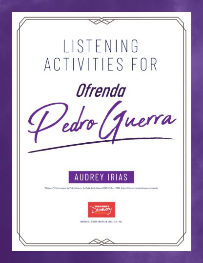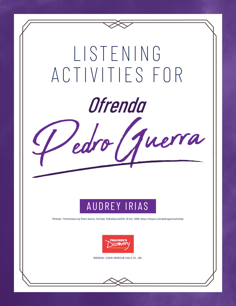 ;ldquo;Te dar;eacute; mi ofrenda para que vuelvas.;rdquo;/em What would you put on an ofrenda/em, in hopes that your lost loved one would return? This six-page activity packet includes six activities around the love song Ofrenda/em by Pedro Guerra. As students listen again and again, each activity focuses on a different element: reading along, discussing the intent of the singer/songwriter, recognizing words, analyzing what the song means, evaluating the symbols used in the video, and writing words as they hear them in blanks for cloze activities. A link to the music video is included.Copyright 2018. English, Spanish. Beginning. 8 x 11 inches. Download. PDF, nine pages. PDF requires Adobe Reader to view. img alt=”” src=”//aedownload.net/teachersdiscovery/images/Author_Audrey_Irias.jpg” style=”float: left; border-width: 0px; border-style: solid; margin: 0px 6px; height: 135px; padding-right: 10px;” /About the Author Audrey Yates Irias started learning Spanish at age 10 in a FLEX program in her elementary school, because her aunt lived in Puerto Rico. She was so enamored with learning languages that she dove in head first, and took multiple years of Spanish and French in high school. Following her passion, she was a double major in Spanish and French Education and a TESOL minor, at Illinois State University–during which time she studied in Spain and France. She taught for 11 years in both traditional as well as virtual classrooms. In 2016, she earned her master’s in Translation and Interpreting from the University of Illinois.Audrey enjoys spending time with her daughter, dancing, teaching students one-on-one, and developing curriculum that benefits students and teachers of World Languages.
