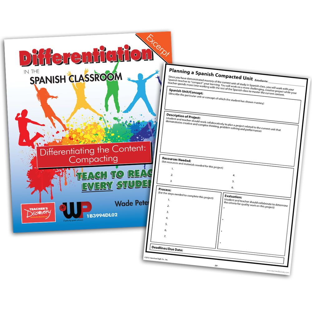 Compact your curriculum with planning and selective assessments, and let students reach beyond their horizons and your expectations, using the ;ldquo;compacting;rdquo; technique. Differentiation in the Spanish Classroom encourages teachers to use a new method of teaching to reach every student individually. Every student learns in a different style and at a different pace. Author Wade Petersen has carefully introduced differentiation and offered suggestions, ideas, and teaching materials to help you integrate differentiation in your classroom.Copyright 2013. Spanish, English. All levels. Reproducible. PDF download, 17 pages. Adobe Reader required to view PDF. img alt=”” src=”//aedownload.net/teachersdiscovery/images/Author_Wade_Petersen.jpg” style=”float: left; border-width: 0px; border-style: solid; margin: 0px 6px; height: 150px; padding-right: 10px;” /About the Author Wade Petersen has been teaching in Iowa for 30 years. He has taught French I, II, III, IV; freshman English; A.P. Composition; A.P. Literature; American literature; world literature and creative writing. He earned his B.A. in French and English from Northwestern College. During his undergraduate years, he studied at theAlliance Fran;ccedil;aisein Paris. In 2001, he earned his master’s degree in Effective Teaching, Learning, and Leadership from Drake University.Petersen has been the recipient of many prestigious awards and has served in leadership roles within the Iowa World Language Association. Petersen’s presentations continue to earn rave reviews, which include being named ;ldquo;Best of Iowa;rdquo; four times. He presents various workshops throughout the U.S. and serves as a keynote speaker at state conferences.Wade Petersen has published over 40 products with Teacher’s Discovery. His best-selling materials are creative, useful, and practical for any classroom. Wade’s publishing philosophy clearly connects with his motto that;ldquo;Creativity Speaks Volumes.;rdquo;
