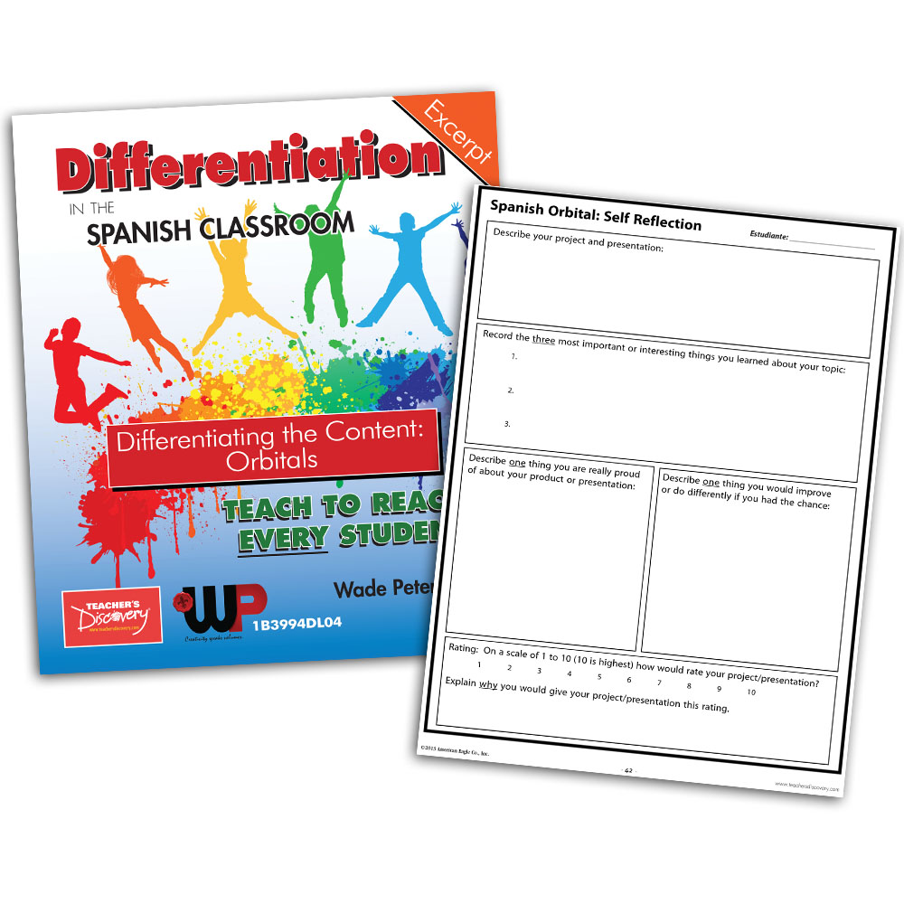 Students invest in what they are learning if it appeals to them when they select projects to pursue. Differentiation in the Spanish Classroom encourages teachers to use a new method of teaching to reach every student individually. Every student learns in a different style and at a different pace. Author Wade Petersen has carefully introduced differentiation and offered suggestions, ideas, and teaching materials to help you integrate differentiation in your classroom.Copyright 2013. Spanish, English. All levels. Reproducible. PDF download, 20 pages. Adobe Reader required to view PDF. img alt=”” src=”//aedownload.net/teachersdiscovery/images/Author_Wade_Petersen.jpg” style=”float: left; border-width: 0px; border-style: solid; margin: 0px 6px; height: 150px; padding-right: 10px;” /About the Author Wade Petersen has been teaching in Iowa for 30 years. He has taught French I, II, III, IV; freshman English; A.P. Composition; A.P. Literature; American literature; world literature and creative writing. He earned his B.A. in French and English from Northwestern College. During his undergraduate years, he studied at theAlliance Fran;ccedil;aisein Paris. In 2001, he earned his master’s degree in Effective Teaching, Learning, and Leadership from Drake University.Petersen has been the recipient of many prestigious awards and has served in leadership roles within the Iowa World Language Association. Petersen’s presentations continue to earn rave reviews, which include being named ;ldquo;Best of Iowa;rdquo; four times. He presents various workshops throughout the U.S. and serves as a keynote speaker at state conferences.Wade Petersen has published over 40 products with Teacher’s Discovery. His best-selling materials are creative, useful, and practical for any classroom. Wade’s publishing philosophy clearly connects with his motto that;ldquo;Creativity Speaks Volumes.;rdquo;