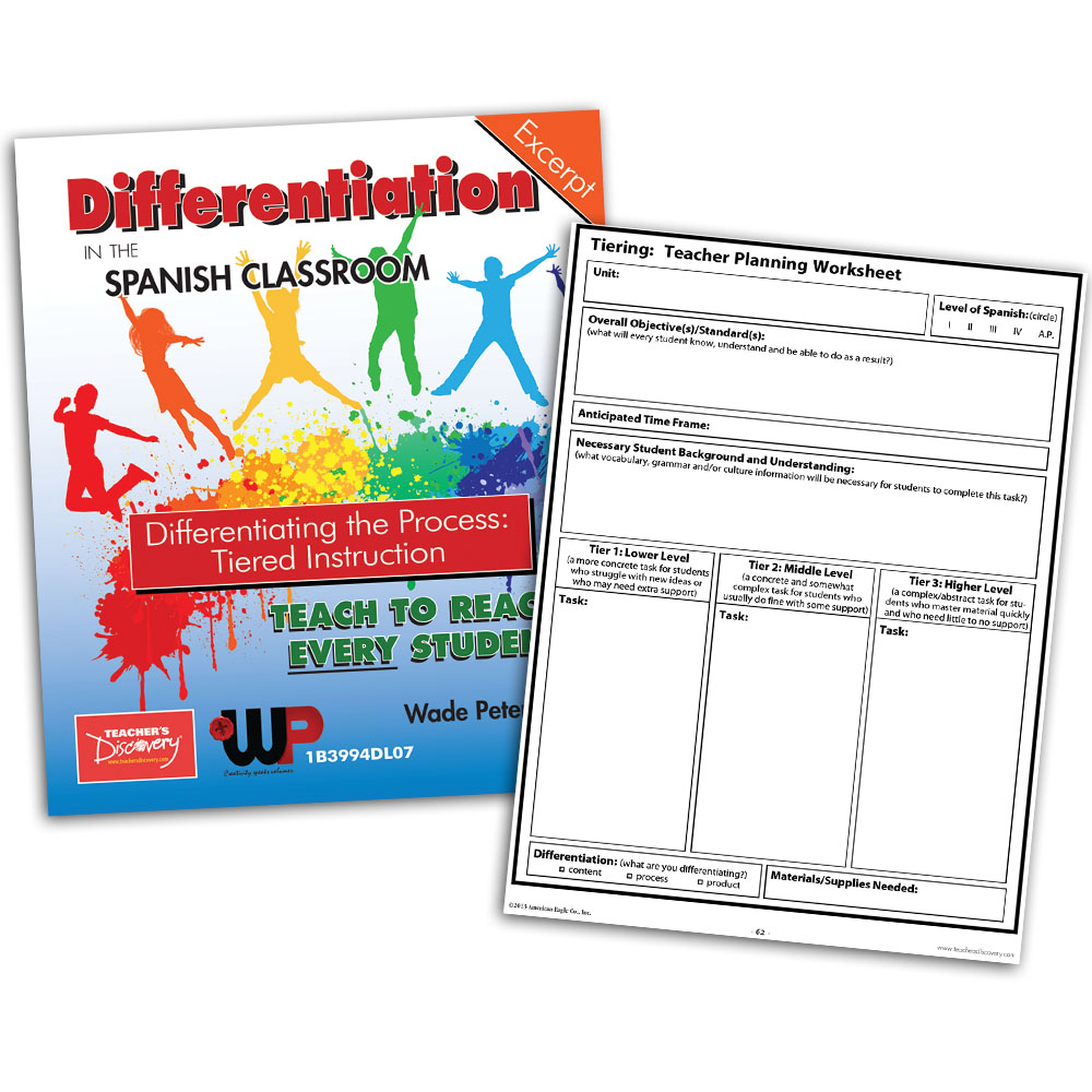 Every world language classroom has students with different ability levels. It helps to plan for tiered instruction for low, middle, and high ability levels. Differentiation in the Spanish Classroom encourages teachers to use a new method of teaching to reach every student individually. Every student learns in a different style and at a different pace. Author Wade Petersen has carefully introduced differentiation and offered suggestions, ideas, and teaching materials to help you integrate differentiation in your classroom.Copyright 2013. Spanish, English. All levels. Reproducible. PDF download, 18 pages. Adobe Reader required to view PDF. img alt=”” src=”//aedownload.net/teachersdiscovery/images/Author_Wade_Petersen.jpg” style=”float: left; border-width: 0px; border-style: solid; margin: 0px 6px; height: 150px; padding-right: 10px;” /About the Author Wade Petersen has been teaching in Iowa for 30 years. He has taught French I, II, III, IV; freshman English; A.P. Composition; A.P. Literature; American literature; world literature and creative writing. He earned his B.A. in French and English from Northwestern College. During his undergraduate years, he studied at theAlliance Fran;ccedil;aisein Paris. In 2001, he earned his master’s degree in Effective Teaching, Learning, and Leadership from Drake University.Petersen has been the recipient of many prestigious awards and has served in leadership roles within the Iowa World Language Association. Petersen’s presentations continue to earn rave reviews, which include being named ;ldquo;Best of Iowa;rdquo; four times. He presents various workshops throughout the U.S. and serves as a keynote speaker at state conferences.Wade Petersen has published over 40 products with Teacher’s Discovery. His best-selling materials are creative, useful, and practical for any classroom. Wade’s publishing philosophy clearly connects with his motto that;ldquo;Creativity Speaks Volumes.;rdquo;