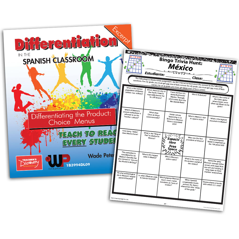 Providing a list of choices on menus, such as weighted, tic-tac-toe, and game show visual menus, gives students ownership over the projects they create in your classroom. Differentiation in the Spanish Classroomencourages teachers to use a new method of teaching to reach every student individually. Every student learns in a different style and at a different pace. AuthorWade Petersenhas carefully introduced differentiation and offered suggestions, ideas, and teaching materials to help you integrate differentiation in your classroom.Copyright 2013. Spanish, English. All levels. Reproducible. PDF download, 34 pages. Adobe Reader required to view PDF. img alt=”” src=”//aedownload.net/teachersdiscovery/images/Author_Wade_Petersen.jpg” style=”float: left; border-width: 0px; border-style: solid; margin: 0px 6px; height: 150px; padding-right: 10px;” /About the Author Wade Petersen has been teaching in Iowa for 30 years. He has taught French I, II, III, IV; freshman English; A.P. Composition; A.P. Literature; American literature; world literature and creative writing. He earned his B.A. in French and English from Northwestern College. During his undergraduate years, he studied at theAlliance Fran;ccedil;aisein Paris. In 2001, he earned his master’s degree in Effective Teaching, Learning, and Leadership from Drake University.Petersen has been the recipient of many prestigious awards and has served in leadership roles within the Iowa World Language Association. Petersen’s presentations continue to earn rave reviews, which include being named ;ldquo;Best of Iowa;rdquo; four times. He presents various workshops throughout the U.S. and serves as a keynote speaker at state conferences.Wade Petersen has published over 40 products with Teacher’s Discovery. His best-selling materials are creative, useful, and practical for any classroom. Wade’s publishing philosophy clearly connects with his motto that;ldquo;Creativity Speaks Volumes.;rdquo;