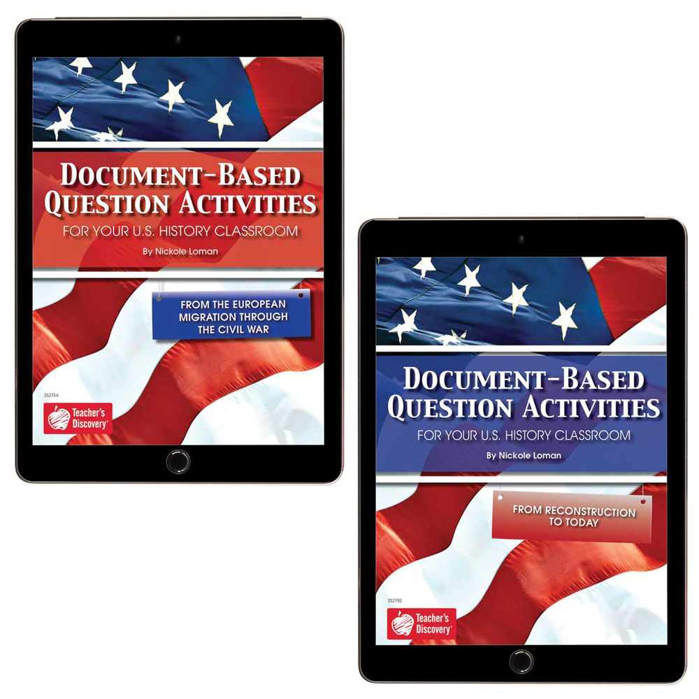 Delve into U.S. History primary source analysis like never before with Document-Based Question Activities. In each of the 28 chronological DBQs, students analyze pivotal eras of history to make valuable connections.div class=”row”div class=”col-lg-8 col-md-6 col-sm-12″ style=”padding: 0px;”Digital Downloadincludes a complete teacher edition PDFand editable PDF student pages for each book. Printable and projectable, digital DBQs are perfect for seamless teaching in class, at home, or any combination. Student DBQ activities are separated into individual and interactive PDF files your students can type directly into. They simply type their responses, save, and send it back to you! A teacher answer key for each DBQ is grouped with the corresponding sample student essay position for easy access! Activities are designed to work with any LMS, including Google Classroom, Canvas, and Schoology./divdiv class=”col-lg-4 col-md-6 col-sm-12″a data-toggle=”modal” data-target=”#imageModal” style=”cursor: pointer;”centerimg src=”//aedownload.net/teachersdiscovery/images/landing/social-studies/Hybrid_Learning_DBQs.gif” style=”width: 80%;”br /span style=”color: #cc3333; font-family: ‘Permanent Marker’, cursive; font-size: 20pt;”Fully Editable Student DBQs!/span/center/a/div/divAssess student progress, practice document analysis, prepare for testing, strengthen historical thinking skills, and more with: Instructions and tips to improve student scores Ready-to-go reproducible primary source documents and analysis questions Essay question prompts with sample positions and a scoring rubric C3 and Common Core national standards alignmentDocument-Based Question Activities from European Migration Through the Civil War: The Great European Migration The Colonies Take Off! Prelude to Revolution The American Revolution Challenges of a New Nation The Constitution His Majesty George Washington? Jefferson Buys 530 Million Acres Growing Pains When Smokestacks Were Beautiful The Race Wars Continue America at a Crossroads The Tragic Prelude to War Brother Against BrotherDocument-Based Question Activities from Reconstruction to Today: Recovery and Expansion The Double-Edged Sword of Capitalism Progressive Spirit and Reform Imperial America The End of Innocence The Roaring Twenties The Great Depression and a New Deal The Last Great War Peace and the Cold War The Flower Children March Chaos, Order, and Social Change The Reagan Revolution The Modern President In Your Lifetime span style=”color:#FF0000;”Download the free sample chapters located in “Additional Info.”/spanCopyright 2019. High school. Reproducible. 135 and 143 pages. Set includes one of each book.Digital Books Download:PDFs.Print Books:Spiral-bound. 8.5 x 11 inches. The print books do NOT include digital PDFs.img alt=”” src=”//aedownload.net/teachersdiscovery/images/Author_Nickole_Loman.jpg” style=”float: left; border-width: 0px; border-style: solid; margin: 0px 6px; height: 200px; padding-right: 10px;” /About the AuthorNickole Loman is currently a seventh-grade social studies teacher in Hendersonville, TN.She adores working with middle school students due to their positive energy and willingness to push themselves to the next level.She has enhanced student motivation with a daily infusion of music, cooperative learning, theatrical performances, lively discussion, and team-building games.Outside of her profession, she enjoys spending time with her pets, reading books, watching historical-fiction television series, listening to 80s and 90s pop music, and constructing social studies lessons.She is especially grateful for her opportunity to work with Teacher’s Discovery, in which she feels a sense of accomplishment by helping other teachers.!– Modal –div class=”modal fade” id=”imageModal” tabindex=”-1″ role=”dialog” aria-labelledby=”imageModalLabel” aria-hidden=”true” div class=”modal-dialog modal-lg” role=”document” div class=”modal-content” div class=”modal-header” h2 class=”modal-title” id=”exampleModalLabel”Fully Editable Student DBQs!/h2 button type=”button” class=”close” data-dismiss=”modal” aria-labe